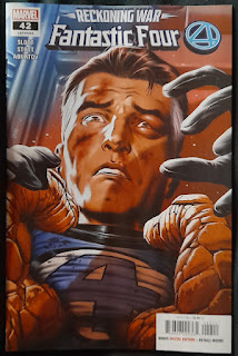Finally, my last read was Fantastic Four #42, which continued the saga of the Reckoning War as Mr Fantastic, the Thing, Jack of Hearts and She-Hulk pursued the agents of the Reckoning after the theft of the M'Kraan crystal from the Shiar. Meanwhile, elsewhere, as Johnny continues to lead forces from Spyre in order to repel the Reckoning's main forces, Valeria, Franklin and the Grimms find themselves cornered in the Baxter Building which leads them to a decision which could force the bond between Ben and Reed to be broken forever.